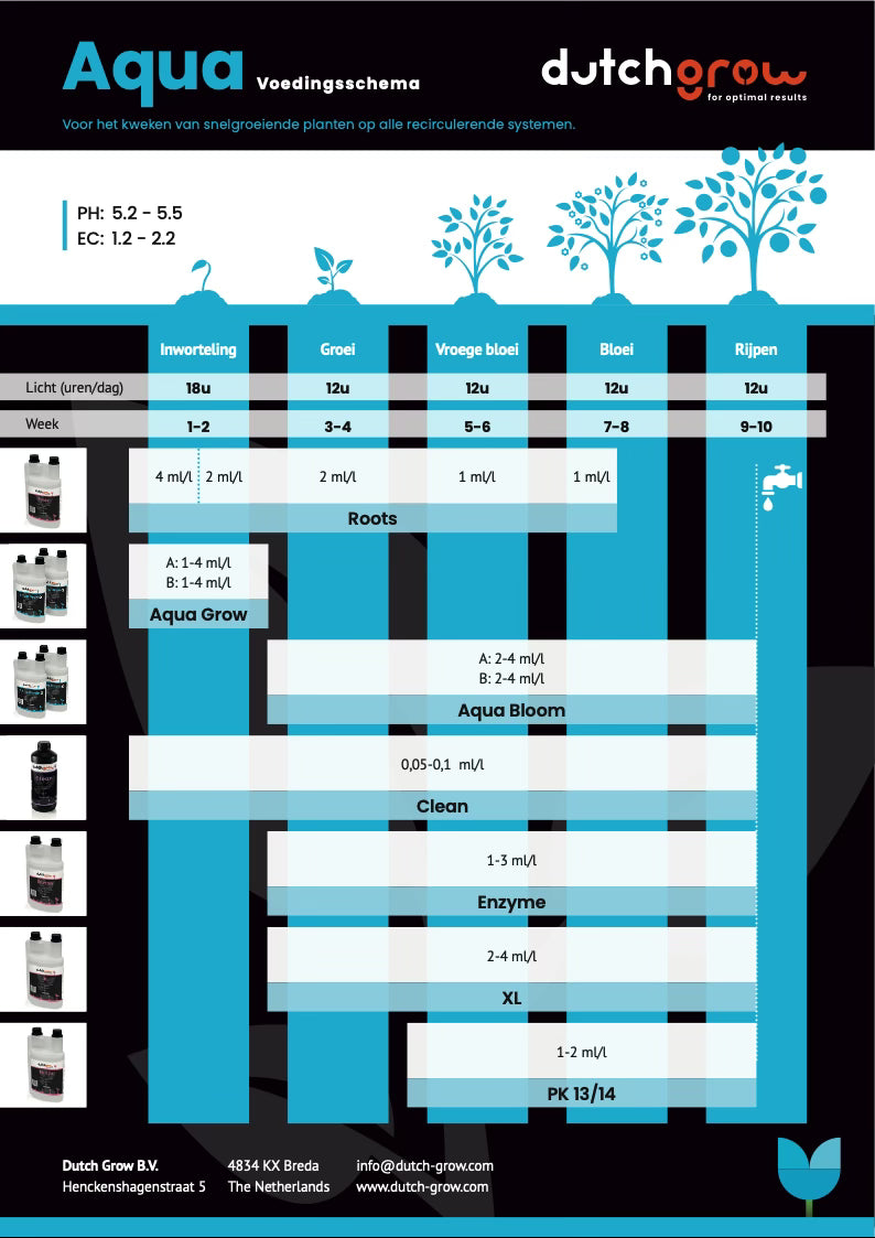 - Voor exacte doseringswaarden: zie voedingsschema op www.dutch-grow.com.