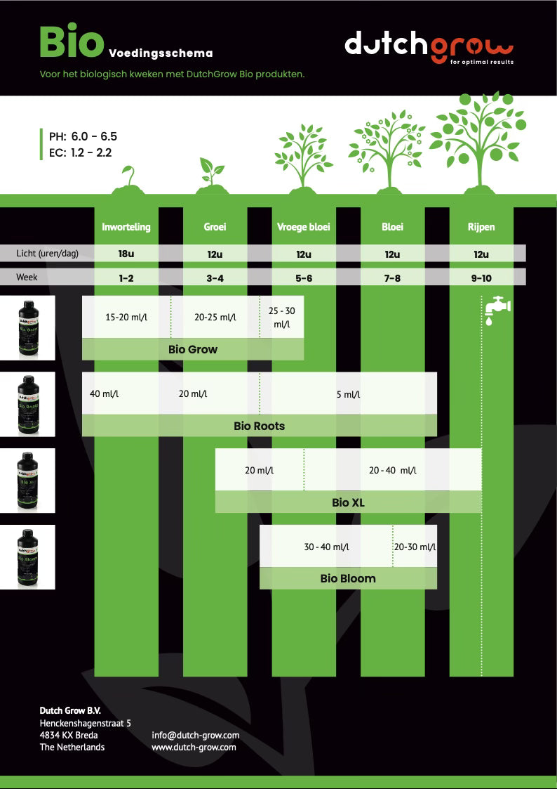 Gebruik DutchGrow Bio Grow voor groeifase, stimulerend voor sterke planten en weelderige wortelontwikkeling met biologisch gebonden stikstof. DutchGrow Roots versterkt de wortels en weerstand van de plant. DutchGrow Bio XL, een natuurlijk gefermenteerd plantenextract, bevordert de bloeifase en verhoogt vruchtsuikergehalte. DutchGrow Bio Bloom ondersteunt de vruchtvorming tijdens de bloeifase, met minder stikstof en meer fosfor en kalium.