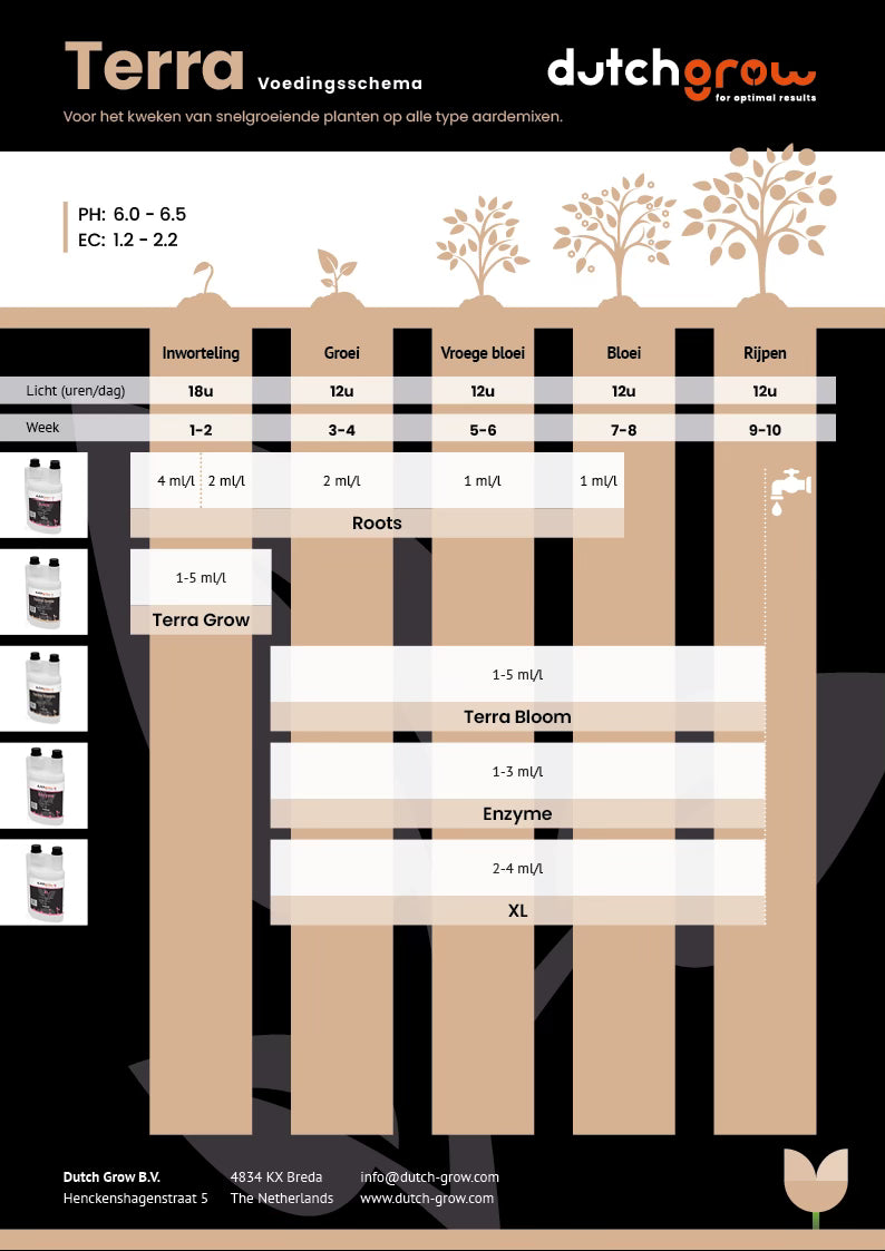 Voor het kweken van snelgroeiende planten op alle type aardemixen, is het Terra voedingsschema van DutchGrow geoptimaliseerd. Begin met DutchGrow Roots tijdens de inwortelingsfase om wortelgroei te stimuleren. Schakel over naar Terra Grow voor de groeifase, gevolgd door Terra Bloom tijdens de bloeifase voor optimale bloei en vruchtontwikkeling. Voeg Enzyme toe voor het afbreken van dode plantenresten en verbetering van het medium. Eindig met DutchGrow XL tijdens de rijpfase om de opbrengst en kwaliteit van de bloeiende planten te verhogen.